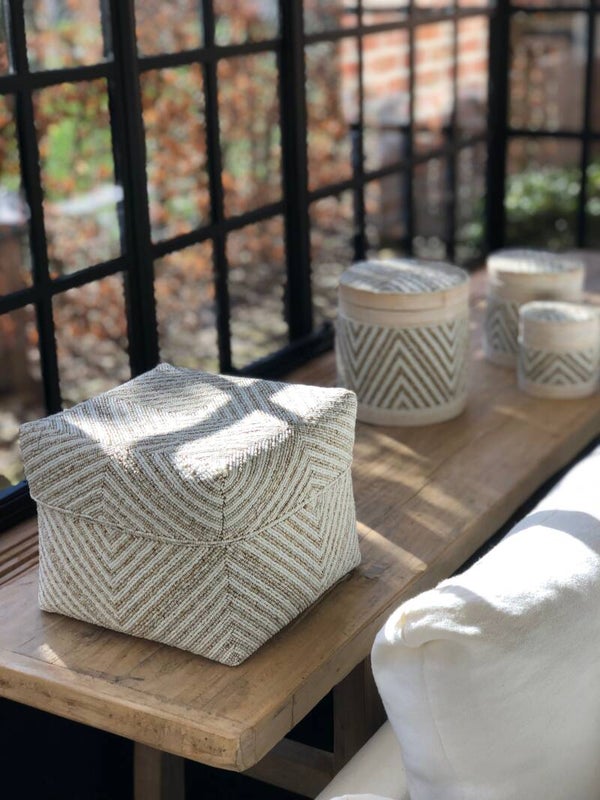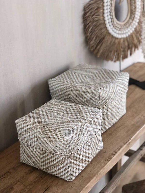 Deze handgemaakte boxen worden eerst gevlochten met bamboe. Daarna worden de pareltjes er op vastgemaakt met naald en draad.